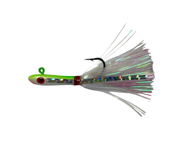 Our version of this classic jig uses a 3/0 heavy wire black nickel hook and is currently available in pink and chartreuse.